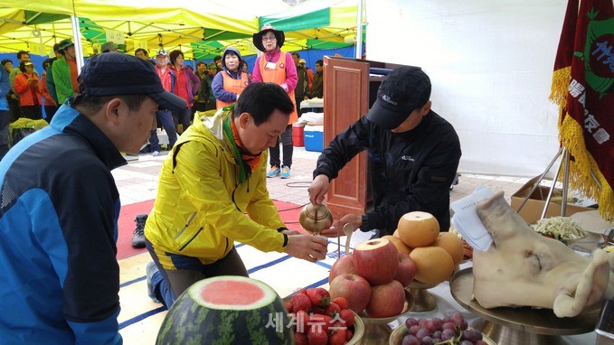 | ▲ 재경담양군향우회 산악회는 3일 낮 12시 서울 용마산에서 시산제를 올렸다. 이날 시산제(始山祭)의 제주(祭酒)인 이정현 군산악회장이 '무사산행' 기원제(祈願祭)에 올릴 잔을 받고 있다. © 세계뉴스 |