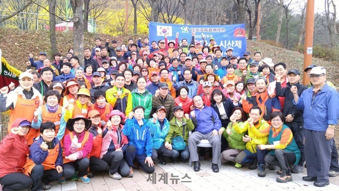 | ▲ 3일 재경담양군향우회 이은성 회장(가운데)과 산악회원 250여명이 시산제(祈願祭)를 마치고 화이팅을 하고 있다. © 세계뉴스 |