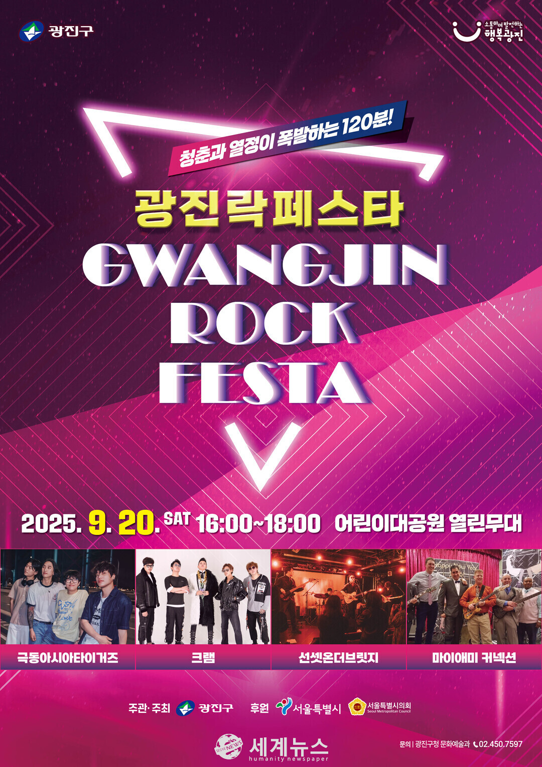 [세계뉴스 = 조홍식 기자] 서울 광진구가 오는 20일 어린이대공원 열린무대에서 '광진 락 페스타'를 개최한다. 이번 행사는 가을의 선선한 날씨 속에서 구민들이 문화생활을 즐기고 힐링할 수 있도록 마련됐다.
