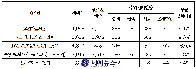 전기자동차 충전소 설치수 상위 단지는 고덕아르테온 388개, 고덕 래미안 힐스테이트 368개, 가재울4구역 DMC 파크뷰자이 246개 등이다.