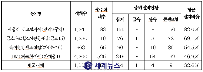 전기자동차 충전소 설치비율 상위 단지를 보면 만리2구역 서울역 센트럴자이 82.0%, 금호15구역 금호파크힐스 이편한세상 69.1%, 흑석6구역 흑석 한강센트레빌2차 54.5% 등이다.