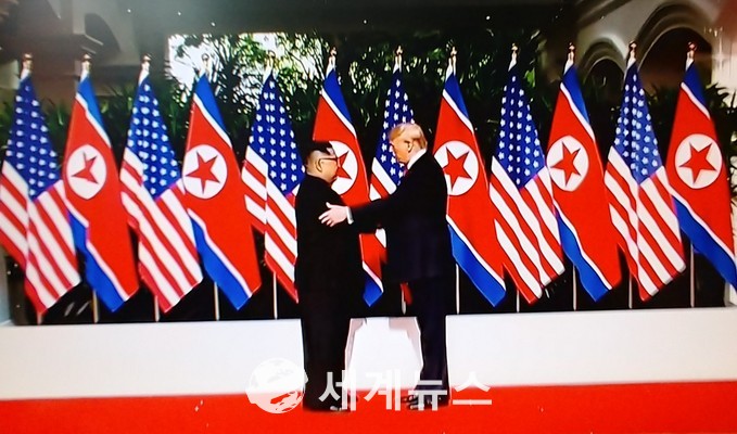 [세계뉴스] 탁병훈 기자 = 북미 ‘세기의 만남’이 마침내 성사됐다. 도널드 트럼프 미국 대통령과 김정은 북한 국무위원장이 12일(현지시간) 중립국인 싱가포르의 휴양지 센토사 섬의 카펠라 호텔에서 처음으로 만나 역사적인 악수를 했다.