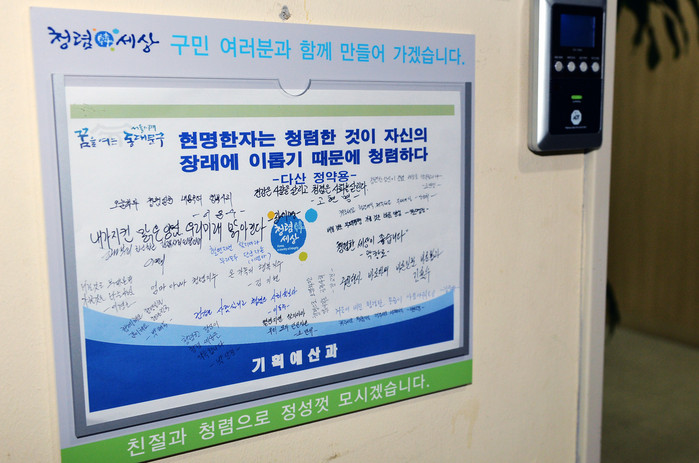 이에 따라 각 부서별로 부서 청렴표어 및 개인별 청렴좌우명을 정하고 이를 청렴 게시판(B4사이즈)에 자필로 작성해 사무실 출입문에 게시했다. 게시판은 정기인사발령이 나는 1월, 7월에 맞춰 1년에 2번씩 새롭게 작성될 예정이다.