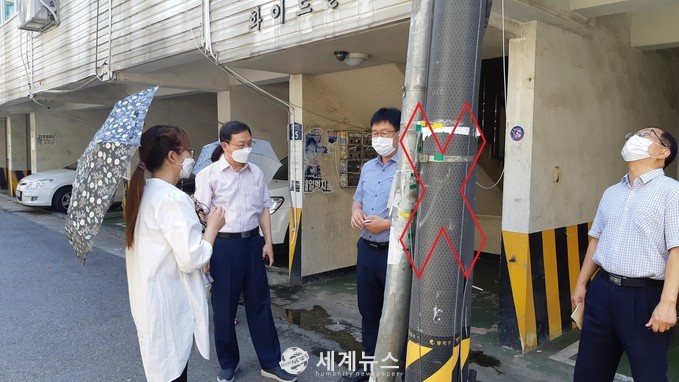 이어 박 의원은 바로 옆 화이트빌라 쪽으로 이동해서 도로를 가로막고 있는 통신주를 지적하며 “과거 빌라건축 당시 이전을 하지 못한 이유를 알 수 없지만 현재 도로를 점유하고 있어서 안전한 차량통행과 주민보행 안전을 위해서는 이전이 필요하다”고 요청했다.