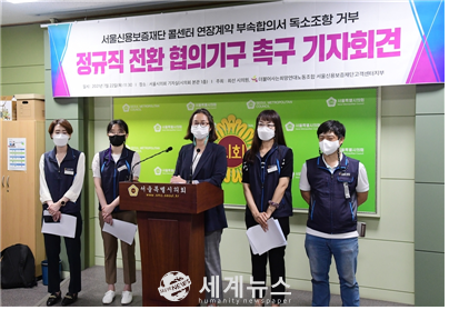 [세계뉴스 정서영 기자] 최선 서울시의원(더불어민주당, 강북3)은 더불어사는희망연대노동조합 서울신용보증재단 고객센터지부와 지난 22일 오전 서울시의회 기자회견장에서 7개월째 답보상태에 빠져있는 서울신용보증재단 콜센터 정규직 전환 논의 협의기구 구성을 조속히 추진하라고 촉구했다.