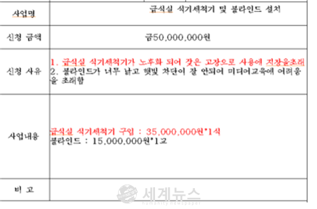특히, 학교들이 기존에 제출한 예산 요구서의 경우 양서강천교육지원청의 ‘ㅁ’ 초등학교는 2017년 예산편성과정서 누락된 긴급 예산이라며 ‘ㄷ’ 업체의 3,500만 원짜리 스마트세척기를 특별교부금 신청하기도 했다. 다른 학교의 경우 애초에는 1천 9백만 원 제품을 신청했으나 추후 2천 9백만 원 제품으로 변경하면서 다른 급식실 조리기구 예산을 줄여야 했다는 것이다.