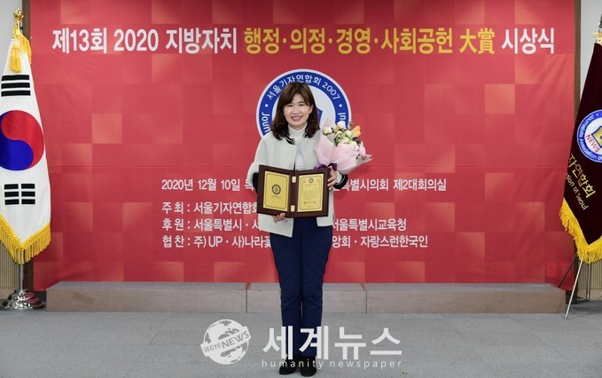 ‘2020 지방자치 의정대상’은 올해 13회째 진행되며 지방의회 위상을 강화하고 시민의 삶의 질 향상을 위해 노력한 지방의원에게 수여하는 상이다. 주최·주관한 서울기자연합회는 건전한 정치문화를 앞당기고 사회의 각 분야에서 뛰어난 노블레스 오블리제를 실천한 인물을 알리기 위해 수상자를 선정했다고 밝혔다.