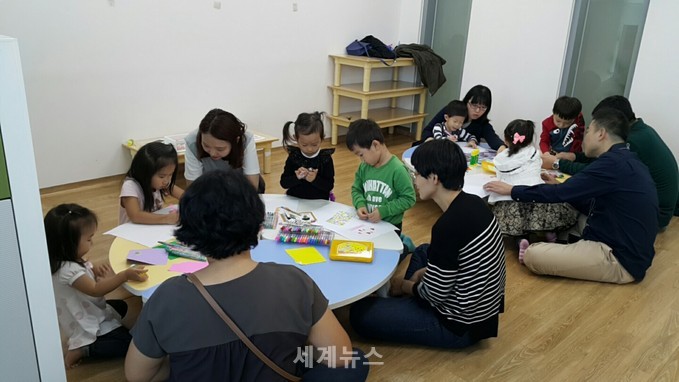 | ▲ 가족품앗이 및 공동육아나눔터. 부모와 아이들이 함께 미술 프로그램을 진행하고 있는 모습 © 세계뉴스 |