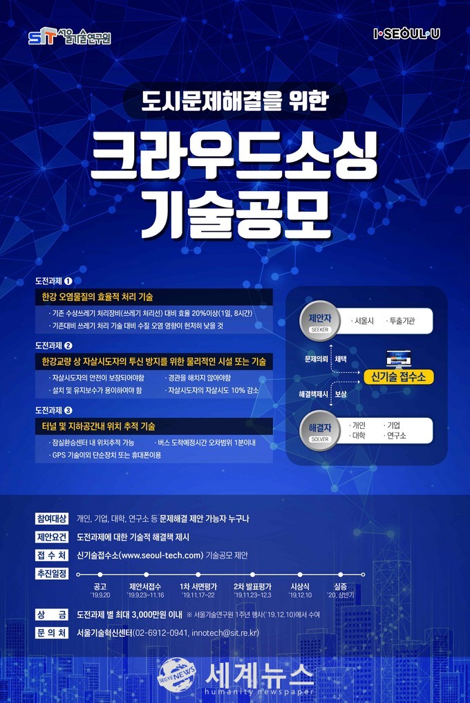 [세계뉴스 조홍식 기자] 서울기술연구원에서는 시민들의 기술 제안과 집단지성으로 도시문제를 해결하기 위한 크라우드소싱 기술공모를 진행한다고 25일 밝혔다.