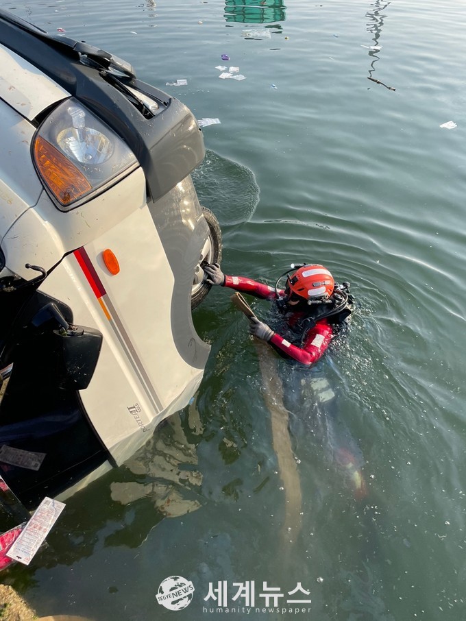 이를 지켜본 어민이 차가 물속에 빠져 잠기고 있고 차량안에 사람이 있는것 같다는 구조요청을 하였다.