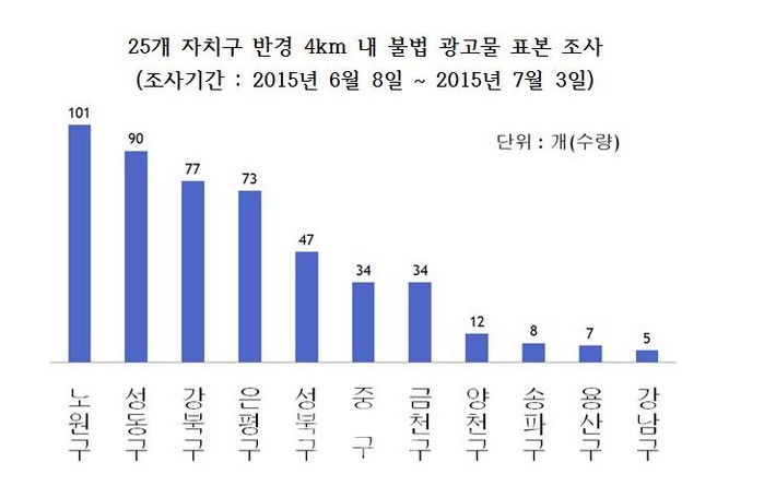 그러면서 “25개 자치구청 반경 4km 내 주요 도로에서 불법 현수막을 표본 조사한 결과 총 886개의 불법 현수막이 적발됐다”며 “이는 서울시내 도로 1km마다 약 9개의 불법 현수막이 게시되어 있음을 의미한다”는 것이다. 특히 불법 현수막 문제는 노원구‧성동구‧강북구 등의 지역이 타 자치구에 비해 심각한 것으로 나타났다. 노원구는 101개를 기록했으며, 같은 구간에서 성동구는 90개, 강북구는 77개의불법 현수막이 적발됐다. 이는 강남구(5개), 용산구(7개)에 비해 그 차이가 확연히 대비되는 수치다.