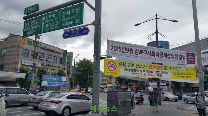 | ▲ 강북구 광산사거리 앞 무분별하게 게시되어 있는 불법현수막 © 세계뉴스 |