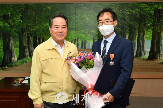 | ▲ 최형식 담양군수는 18일 담양군청에서 ‘제6회 대한민국 공무원상’ 수상자에 대한 정부 유공 포상 전수식에서 농업기술센터 이철규 과장에게 시상했다. |