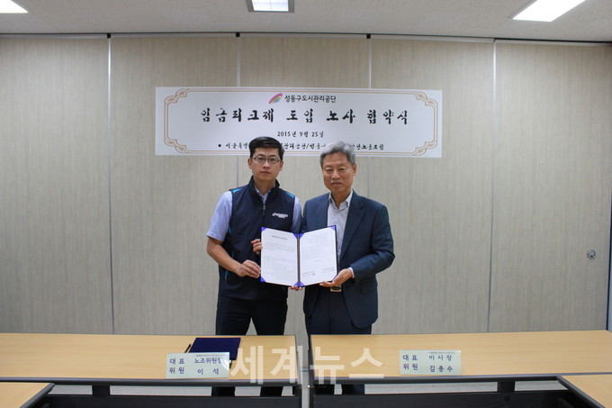 | ▲ 성동구도시관리공단 김종수 이사장(오른쪽)과 이석 노조위장(왼쪽)은 25일 임금피크제를 전격 시행하기로 합의했다. 이로써 성동구도시관리공단이 서울시 24개 자치구 공단 중 최초 임금피크제 시행 공단이 됐다. © 세계뉴스 |