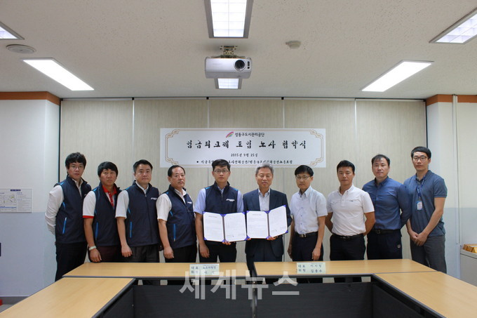 | ▲ 임금피크제 도입 노사협약식. 25일 성동구도시관리공단 김종수 이사장(가운데)과 이석 노조위장은 임금피크제 도입을 전격 시행하기로 합의했다. 이로써 서울시 24개 자치구 공단 중 성동구도시관리공단이 최초 임금피크제 시행 공단이 됐다. © 세계뉴스 |