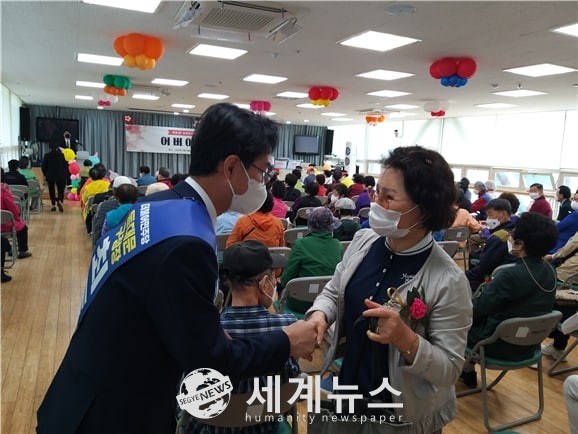 | ▲ 최동민(왼쪽) 더불어민주당 동대문구청장 예비후보가 8일 어버이날 행사에서 어르신들에게 인사를 나누고 있다. |