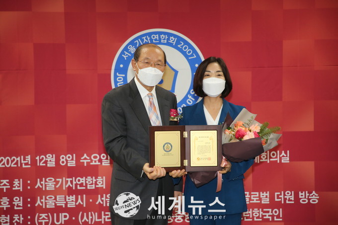 | ▲ 지난 8일 오후 서울기자연합회 ‘2021 지방자치 大賞’ 시상식에서 김안숙(오른쪽) 서초구의회 의장이 의정대상을 수상했다. (기자단 제공) |