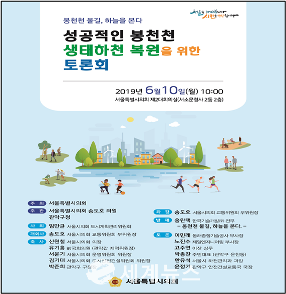 [세계뉴스] 정서영 기자 = 서울특별시의회 교통위원회 송도호 부위원장(더불어민주당, 관악1)은 오는 10일 오전 10시 서울시의회 제2대회의실(서소문청사 2동 2층)에서 관악구청과 함께 ‘봉천천 물길, 하늘을 본다.’라는 주제로 “봉천천의 성공적인 생태하천 복원을 위한 토론회”를 개최한다.