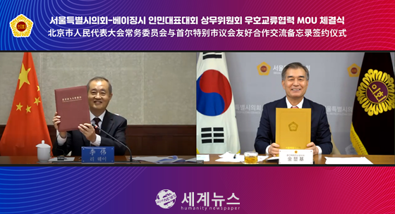 [세계뉴스 윤소라 기자] 서울특별시의회 김현기 의장은 지난 19일 오후 4시 리웨이 중국 베이징시 인민대표대회 상무위원회 주임과 화상회의를 개최했다. 이번 화상회의는 한중 수교 30주년을 맞아 양국 수도 의회의 우호 교류 협력 MOU를 체결하기 위해 서울특별시의회의 제안으로 성사됐다.