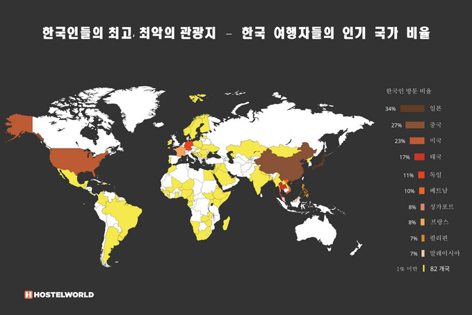 | ▲ 호스텔월드 미트 더 월드보고서의 한국 성인이 가장 많이 방문한 국가 탑 10 © 세계뉴스 |