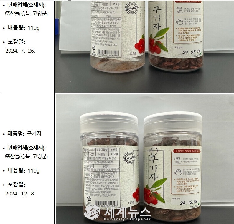 [세계뉴스 = 전승원 기자] 식품의약품안전처는 경북 고령군에 위치한 ㈜산들이 포장 및 판매한 국내산 '구기자(농산물)'에서 잔류농약이 기준치인 0.01mg/kg을 초과 검출됐다고 발표했다. 이에 따라 해당 제품의 판매를 즉시 중단하고 회수 조치를 취하기로 했다.