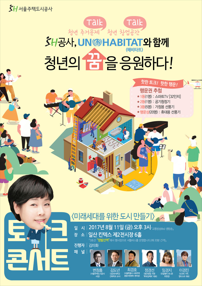 [세계뉴스] 전승원 기자 = 서울주택도시공사가 주최하고 UN해비타트가 함께하는 “청년의 꿈을 응원하다” 의 ‘미래세대를 위한 도시만들기 토크콘서트’가 오는 11일 오후 3시 일산 킨덱스 제2전시장(6홀)에서 열린다.