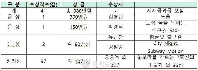 수상자에게는 금상 300만원, 은상 150만원 등 총 상금 980만원 및 상장이 수여될 예정이다. 금상에는 김형민 씨의 ‘노을’, 은상에는 박경식 씨의 ‘도심 속을 누비는 퇴근길 열차’, 동상에는 유근찬 씨의 ‘황금빛 출근길’과 김철승 씨의 ‘City Night, Subway Motion’이 선정됐다. 주요 수상작은 다음과 같다.