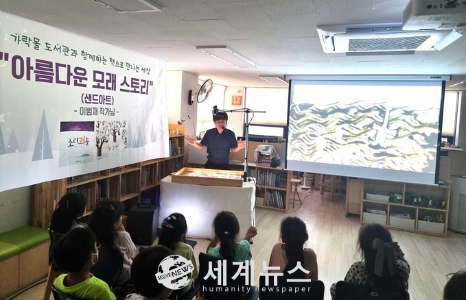 | ▲ 이범재 작가는 ‘내 모습 이대로를 사랑해’라는 주제로 샌드아트로 읽는 도서 ‘꾸고’ 공연과 읽고 함께 이야기를 나누는 도서 ‘노스애르사애’를 선보였다. |