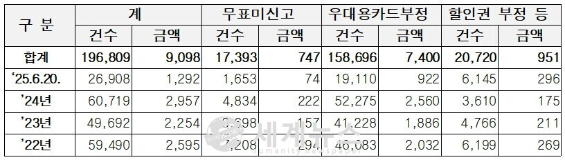 (단위: 건, 백만원 / ’25.6.20.기준). 22년부터 24년까지 3년간 단속 부정승차 건수.