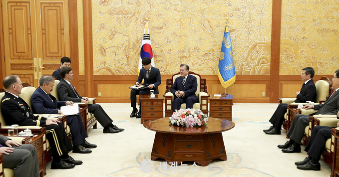 [세계뉴스] 탁병훈 기자 = 문재인 대통령은 9일 오후 2시 청와대 본관에서 에스퍼 미국 신임 국방장관을 접견했다.