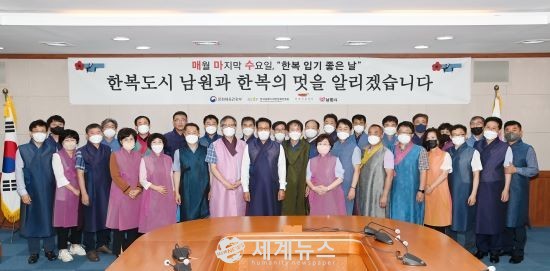 [세계뉴스 이정열 기자] 남원시가 한복문화도시 남원의 면모를 다양하게 알리기 위해 31일 개최된 소통행정 보고회에 최경식 남원시장과 간부공무원 모두 한복을 입고 회의에 참석했다.