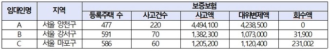또한, 등록임대주택 591채를 소유한 B씨는 역시 70채에서 총 138억 원의 전세보증금을 돌려주지 않았으며, 등록임대주택 586채를 소유한 C씨 역시 총 60가구에서 받은 전세보증금을 돌려주지 않아 주택도시보증공사에서 총 112억 400만원을 대위변제한 것으로 알려졌다.