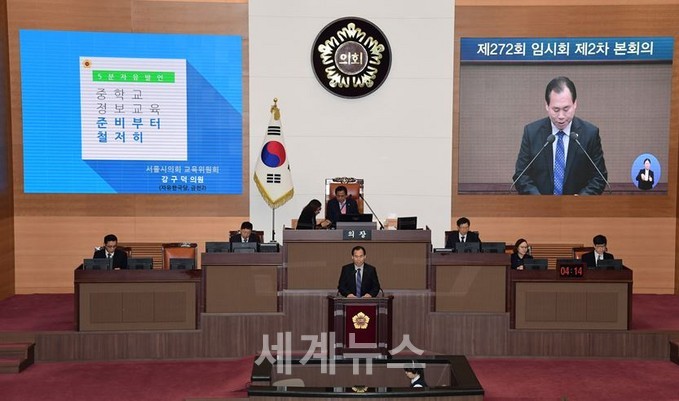 | ▲ 제272회 임시회 제2차 본회의에서 강구덕 의원이 5분 자유발언을 통해 “현재 서울시 관내 컴퓨터실이 없는 32개 중학교의 컴퓨터실 구축과 노후화된 컴퓨터 교체 등을 주문하며 2019년 ‘정보’교과 첫 수업에 차질이 없도록 철저히 해달라"고 당부했다. © 세계뉴스 |