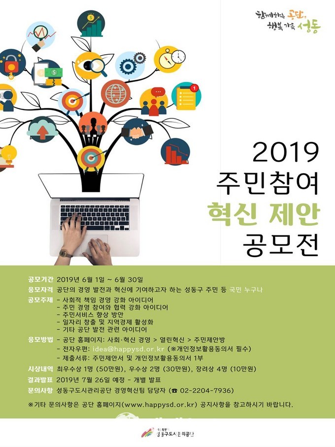 [세계뉴스] 조홍식 기자 = 성동구도시관리공단(이사장 김종수)이 1일부터 30일까지 한 달 간 ‘주민참여 혁신 제안 공모전’을 개최한다.