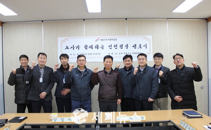 [세계뉴스] 조홍식 기자 = 성동구도시관리공단(이사장 김종수, www.happysd.or.kr)은 지난 12월 27일 이사장 및 노조위원장, 각 팀장이 참석하여 ‘인권경영 선언문 선포식’을 개최했다고 밝혔다.