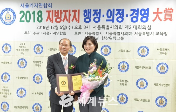 [세계뉴스] 전승원 기자 = 서울 강서구의회 보건복지원회 정정희 위원장(더불어민주당·바선거구 등촌3동, 가양2동)은 지난 5일 서울특별시의회 의원회관 제2대회의실에서 서울기자연합회가 주관하고 서울특별시와 서울특별시의회가 후원하는 ‘2018 지방자치 행정·의정·경영 大賞’ 에서 의정대상을 수상하는 영예를 안았다.