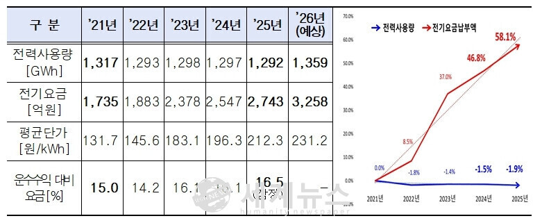 실제 서울교통공사의 전기요금 부담은 이미 급증했다. 2021년 1,735억 원이던 전기요금 납부액은 2023년 2,743억 원으로 58.1% 증가했다. 같은 기간 운수수익에서 전기요금이 차지하는 비중도 2021년 15%에서 2025년 16.5%까지 오를 것으로 전망된다. 수입은 정체된 반면 비용 구조에서 전기요금이 차지하는 비중이 빠르게 커지고 있는 셈이다.