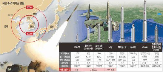 | ▲ 북한 주요 미사일 현황. 스커드 미사일 발사시 2분30초면 서울에 도달한다. © 세계뉴스 |
