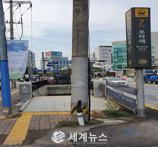 [세계뉴스 조홍식 기자] 거리를 걷다보면 엉뚱한 위치에 박혀있는 전신주 때문에 종종 당황스러울 때가 있다. 바로 보라매역 7번 출구 앞에 커다란 전신주로 인해 출퇴근길은 물론 이곳을 이용하는 시민들은 불편을 감수해야 했다.