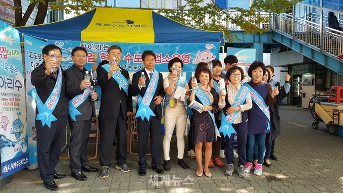 | ▲ 15일 노원구 상계동 벽산아파트에서 북부수도사업소 “1일 현장 수도사업소장”으로 위촉 된 김광수 서울시의원(왼쪽 4번째)이 안전하고 깨끗한 아리수를 시민들에게 직접 알리고 있다. © 세계뉴스 |