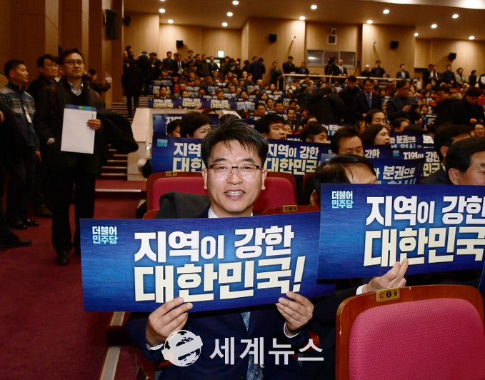 | ▲ 2019 더불어민주당 참좋은지방정부위원회 발대식. 김용석 대표의원이 '지역이 강한 대한민국!' 피켓을 들고 있다. |