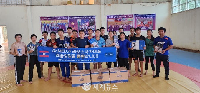 | ▲ 한국의료기유통협회 회원사인 아미글로벌 유실근 회장과 한성메디 한광훈 대표가 라오스 레슬링 국가대표 김수길 감독 외 선수들을 지원하고 있다. |