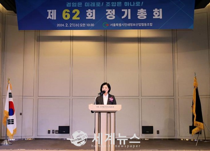 | ▲ 지난 21일 서울특별시인쇄정보산업협동조합 2024년도 제62회 정기총회에서 옥재은 서울시의원이 인사말을 하고 있다. |