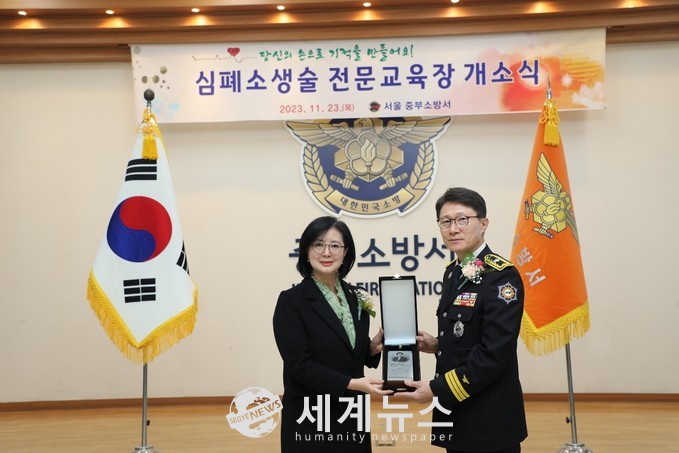 [세계뉴스 윤소라 기자] 서울특별시의회 행정자치위원회 옥재은 의원(중구2, 국민의힘)이 지난달 23일 서울중부소방서(서장 권태미) 심폐소생술 전문 교육장 개소식 자리에서 서울특별시 소방재난본부로부터 시민의 안전을 위해 심폐소생술 교육환경 및 품질 향상에 크게 기여한 공로를 인정받아 감사패를 받았다.