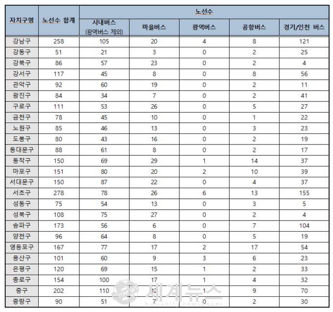 서울시가 ‘시내버스 노선조정 업무처리 지침’에 따라 시내버스 노선을 객관적이고 합리적으로 관리하고 있지만 김 의원이 서울시의회 법제담당관에게 의뢰한 입법검토 결과에 의하면 강남 3구는 173개~278개의 버스 노선이 경유하는 반면 강동구는 51개 노선에 불과해 자치구별 대중교통 이용 편익에 큰 차이가 발생하고 있음이 확인됐다.