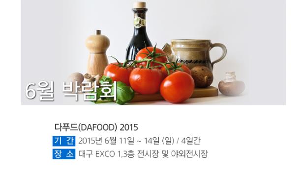특히 식품산업의 새로운 패러다임을 보여줄 제15회 다푸(DAFOOD 2015)는 전국 199개소의 식품업체가 446여개의 부스를 설치하고, 신제품 소개 및 식품산업의 진보를 한 눈에 보여줄 전시장이 운영된다.