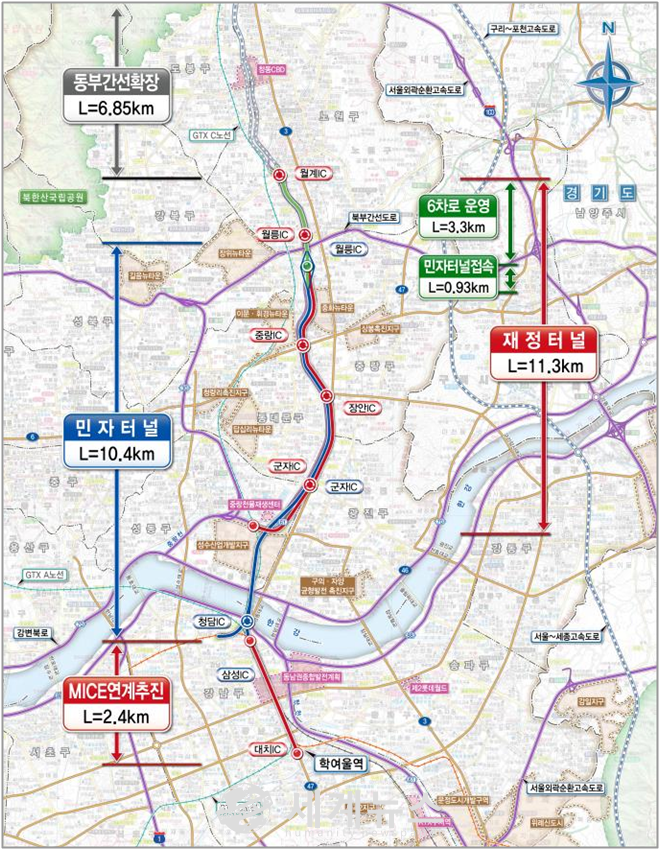 이번에 민자적격성 조사를 통과한 구간은 동부간선도로 월릉IC ~ 영동대로(경기고앞)에 대심도 도로터널 4차로, 10.4km 구간으로 2026년 완공해 개통한다는 목표다. 시는 앞으로 민간투자심의 등 관련 행정절차를 거쳐 올해 하반기 제3자제안 공고를 실시하고, '21년까지 실시설계 완료, '22년에 착공한다는 계획이다.