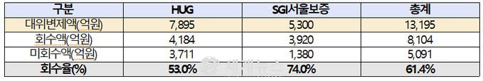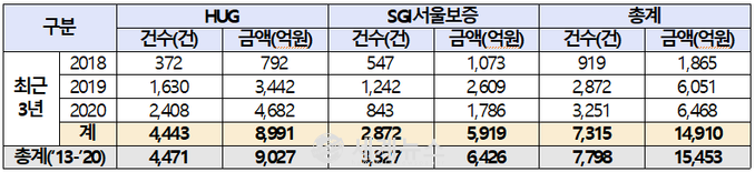 국회 국토교통위원회 소속 소병훈 의원이 주택도시보증공사(이하 HUG)와 SGI서울보증이 제출한 전세보증금 반환보증보험 가입 실적 및 사고 현황을 분석한 결과 2013년부터 2020년 말까지 주택도시보증공사가 대위변제한 금액은 7895억 원, SGI서울보증이 대위변제한 금액은 5300억 원으로 두 기관의 대위변제액이 1조 3195억 원에 달하는 것으로 확인됐다.