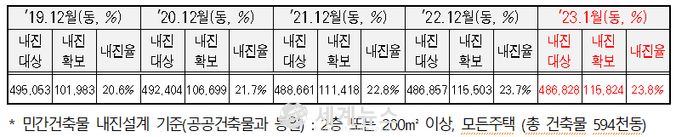 서울시가 제공한 자료에 의하면 서울시의 민간건축물 중 2023.1월 기준으로 내진 대상(2층 또는 200㎡ 이상 + 모든 주택) 총 486,828동 중 115,824동만 내진을 확보하여 내진 확보율이 23.8%에 불과하다고 지적했다.