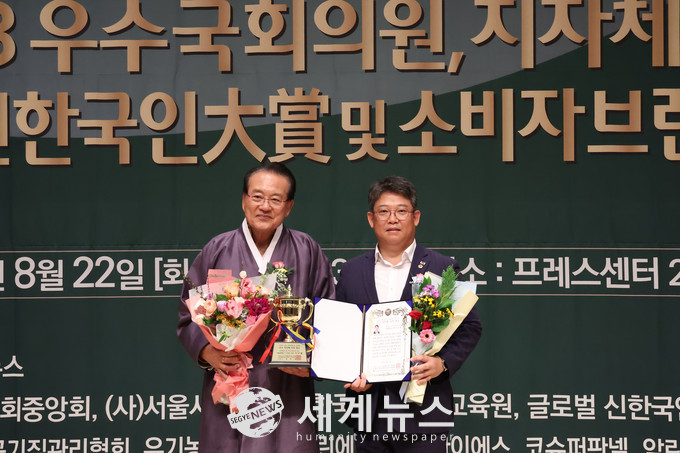 | ▲ 서상열(오른쪽) 서울시의원이 22일 시사대한뉴스 주최, 대한노인중앙회와 서울시민회 등이 주관하는 ‘2023 지자체 의정대상’에서 의정발전 및 지역사회공헌 부문 의정대상을 수상했다. |